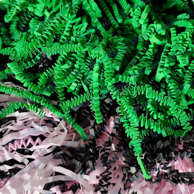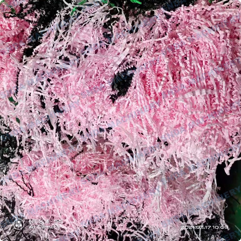 The product crinkle paper made by our Crinkle Paper Shredding machine,or we called crinkle paper shredder,these finished paper is a new type of environmentally-friendly decorative shock-proof material that we have newly developed in recent years. It is widely used as filling paper for gift boxes, glass bottles, wine packaging filling, electronic product filling, ceramic,glass products and various fragile items packaging filling to prevent shocks. It is a very popular method of candy packaging at present.